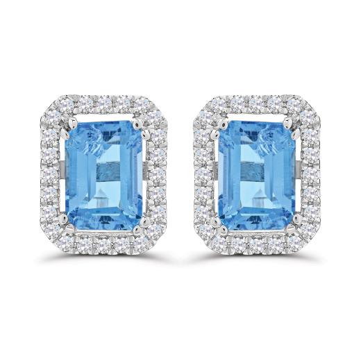 These fantastic stud earrings are made with octagon-cut swiss-blue topaz gemstone and encircled with round-cut white zircons set in lustrous white gold. Add a touch of glamour with these beautiful earrings that are secured with butterfly backs.