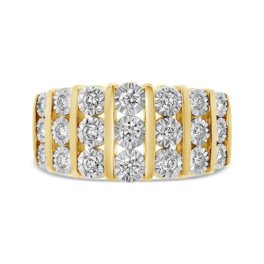 Emanating with the fiery brilliance of Canadian diamonds, the Glacier Fire 10K Yellow Gold Diamond Band is a radiant expression of sophistication. Crafted in lustrous yellow gold, this band showcases a captivating design with vertical rows of three diamonds each, set in illusion settings to create a seamless and dazzling display. The total carat weight of 0.50 CTW ensures a striking and noticeable sparkle. This band is not just a piece of jewellery; it's a symbol of timeless elegance. Whether worn as a standalone statement or stacked with other rings, this Glacier Fire diamond band adds a touch of luxury to any occasion, making it a treasured addition to your collection. Revel in the brilliance and craftsmanship of this exquisite 10K yellow gold diamond band, a reflection of enduring beauty.