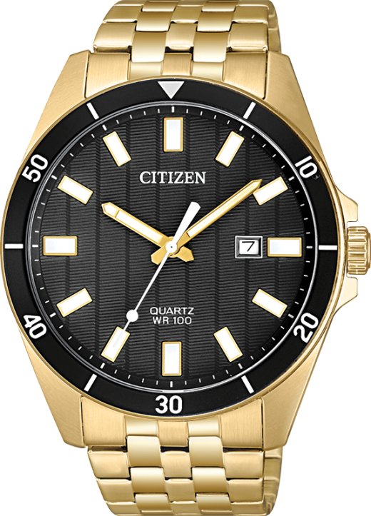 Citizen Quartz round gold-tone stainless steel case and bracelet, black aluminum bezel ring, black dial, date, 42mm case, Water Resistant100, fold over clasp with push button.